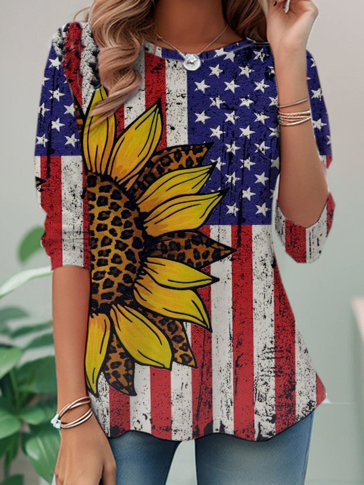 Casual Long Sleeve Crew Neck Daisy Loose Regular T-Shirt