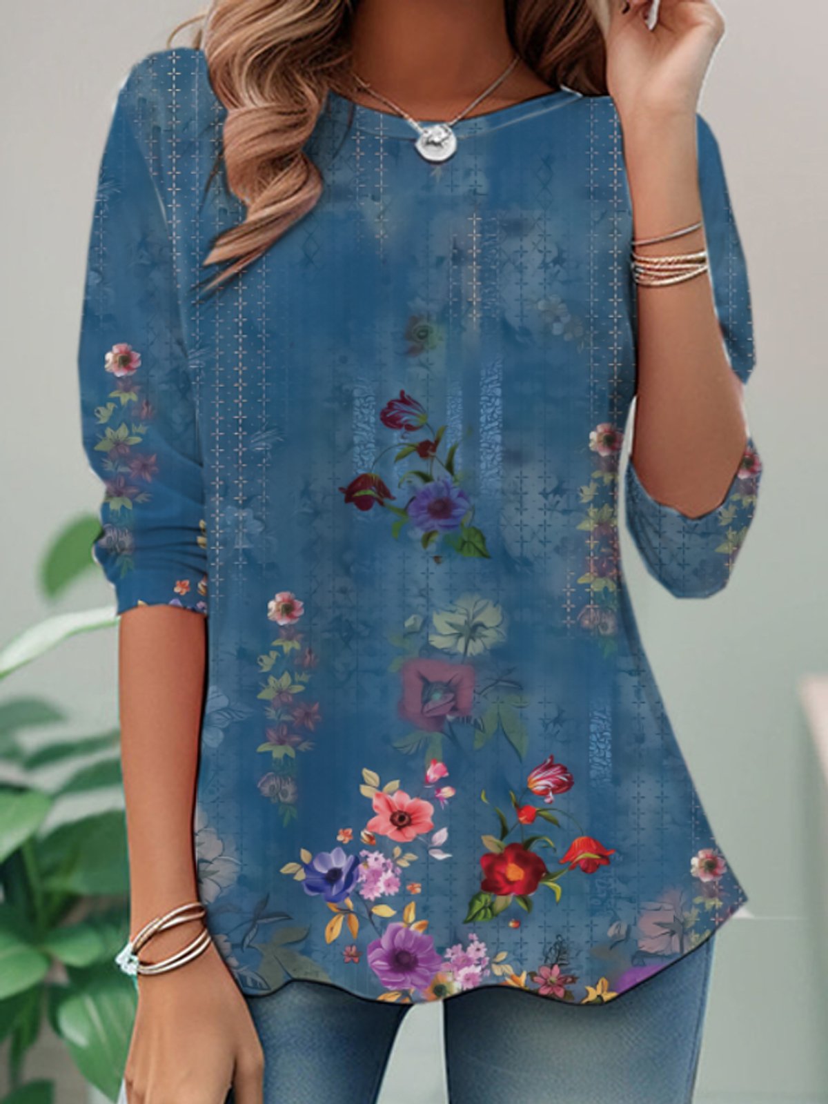 Casual Long Sleeve Crew Neck Floral Loose Regular T-Shirt