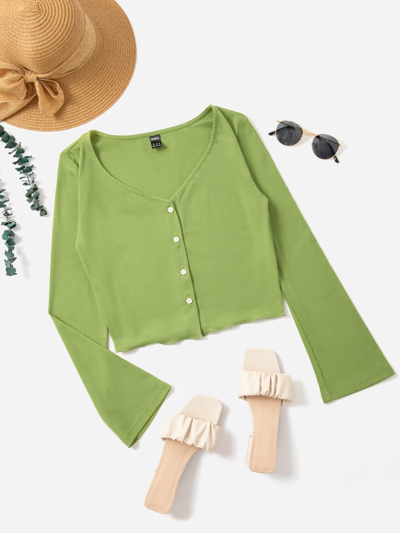 Casual Plain Button Front Long Sleeve V Neck Crop Women Top