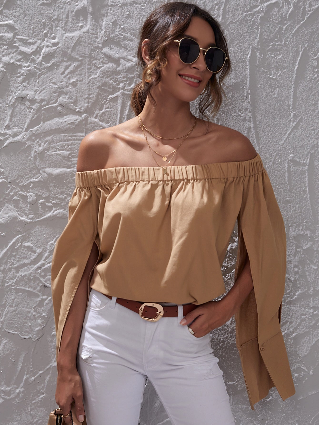 Casual Plain Split Long Sleeve Off The Shoulder Regular Blouse