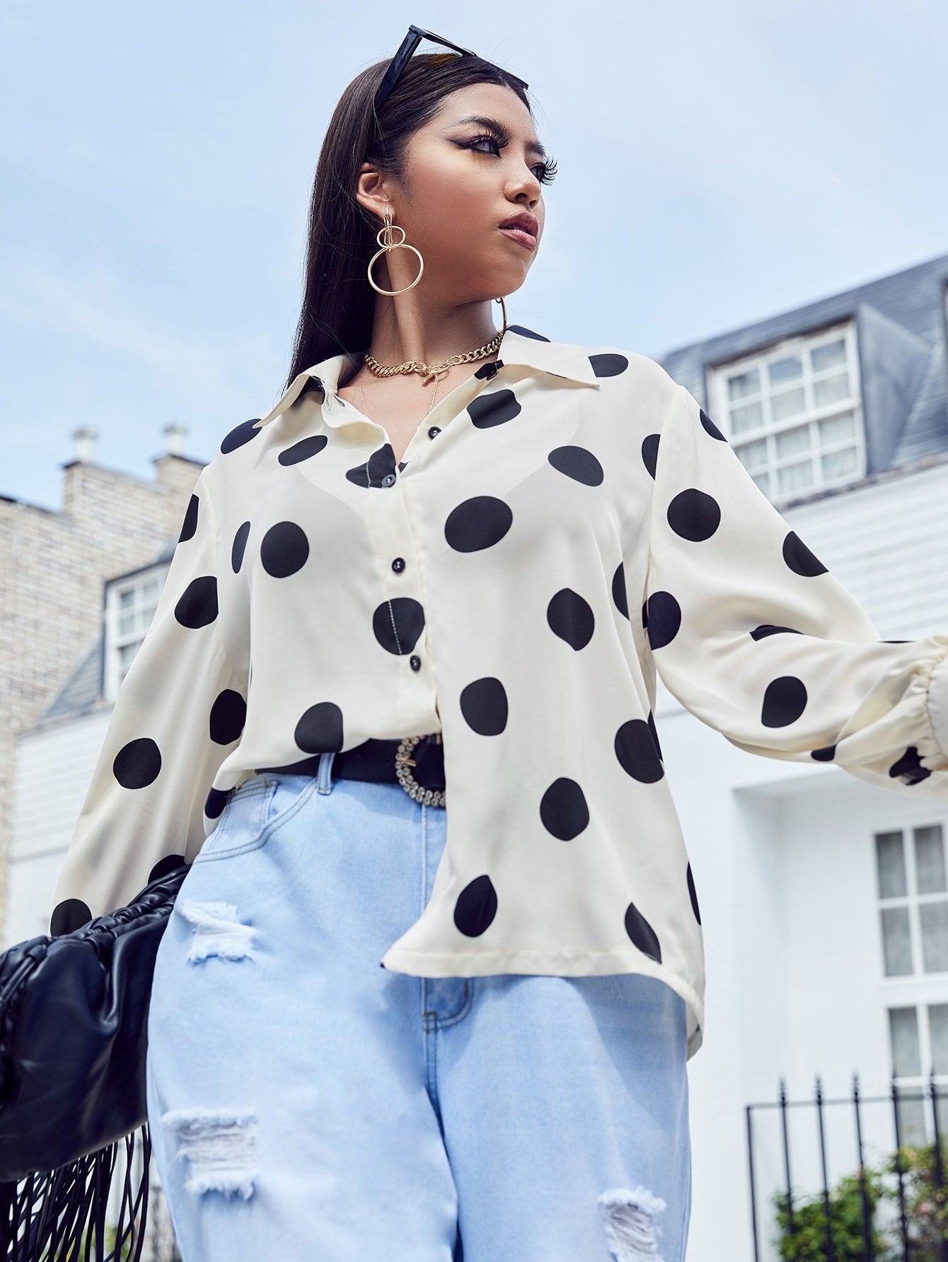 Casual Polka Dot Button Front Long Sleeve Collar Semi-Sheer Asymmetrical Regular Plus Size Blouse