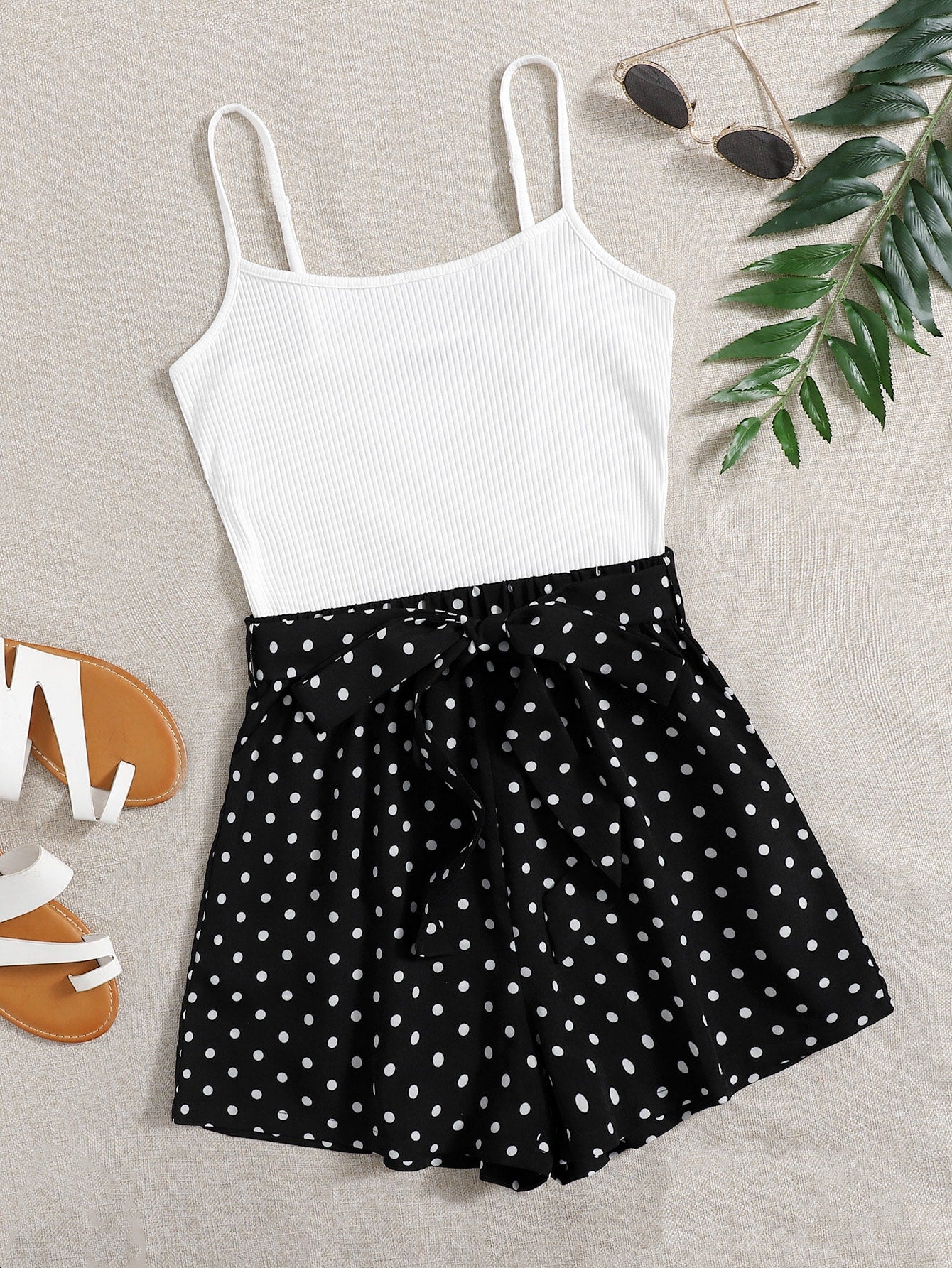 Casual Polka Dot Rib-Knit Sleeveless Spaghetti Strap High Waist Short Women Jumpsuit