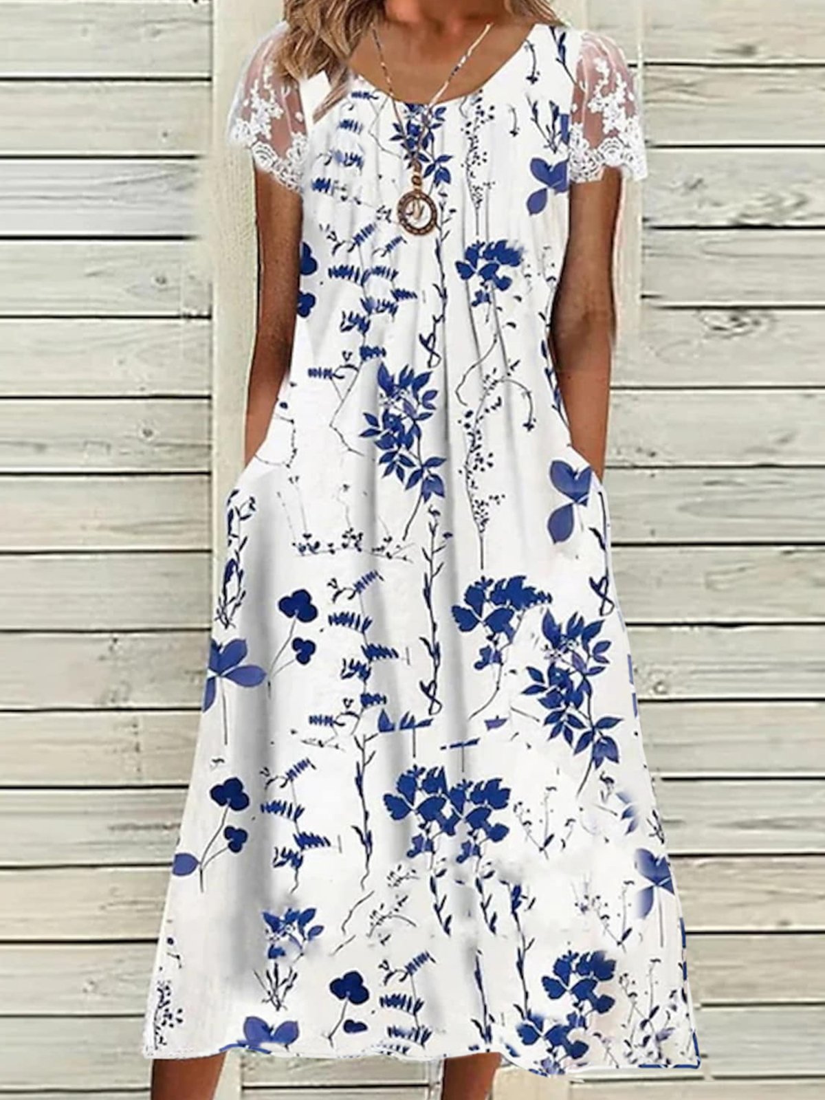 Casual Short Sleeve Crew Neck Floral Loose Midi Dress