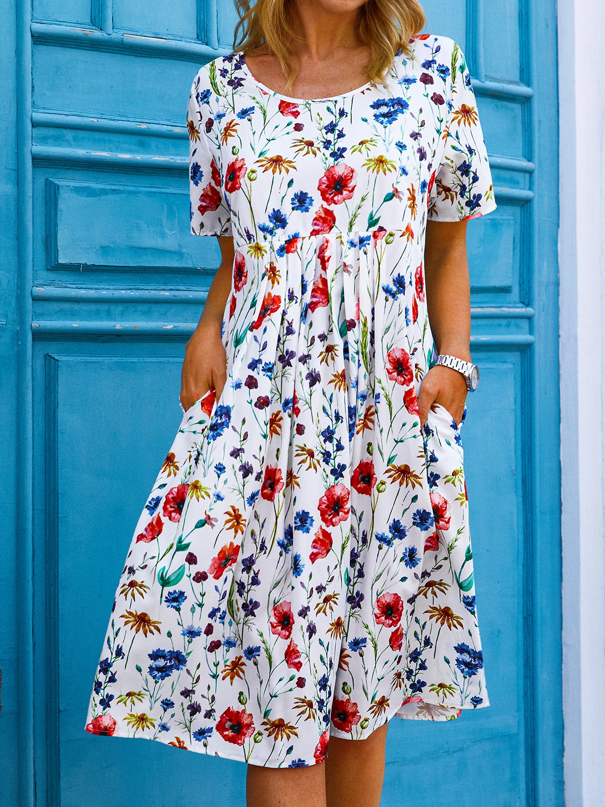 Casual Short Sleeve Crew Neck Floral Midi Dress