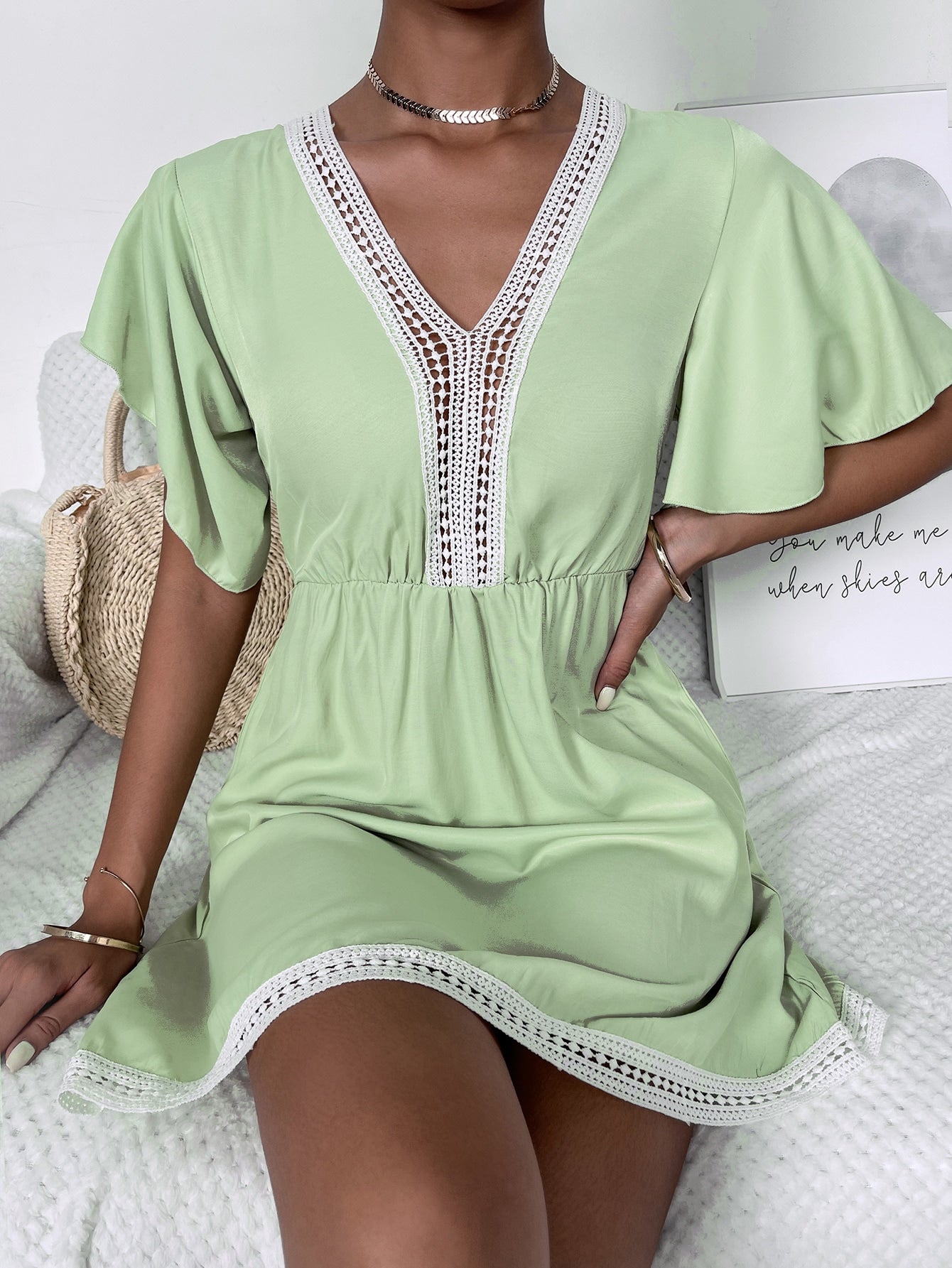 Colorblock Contrast Lace Short Sleeve V Neck Flared High Waist Short Dress