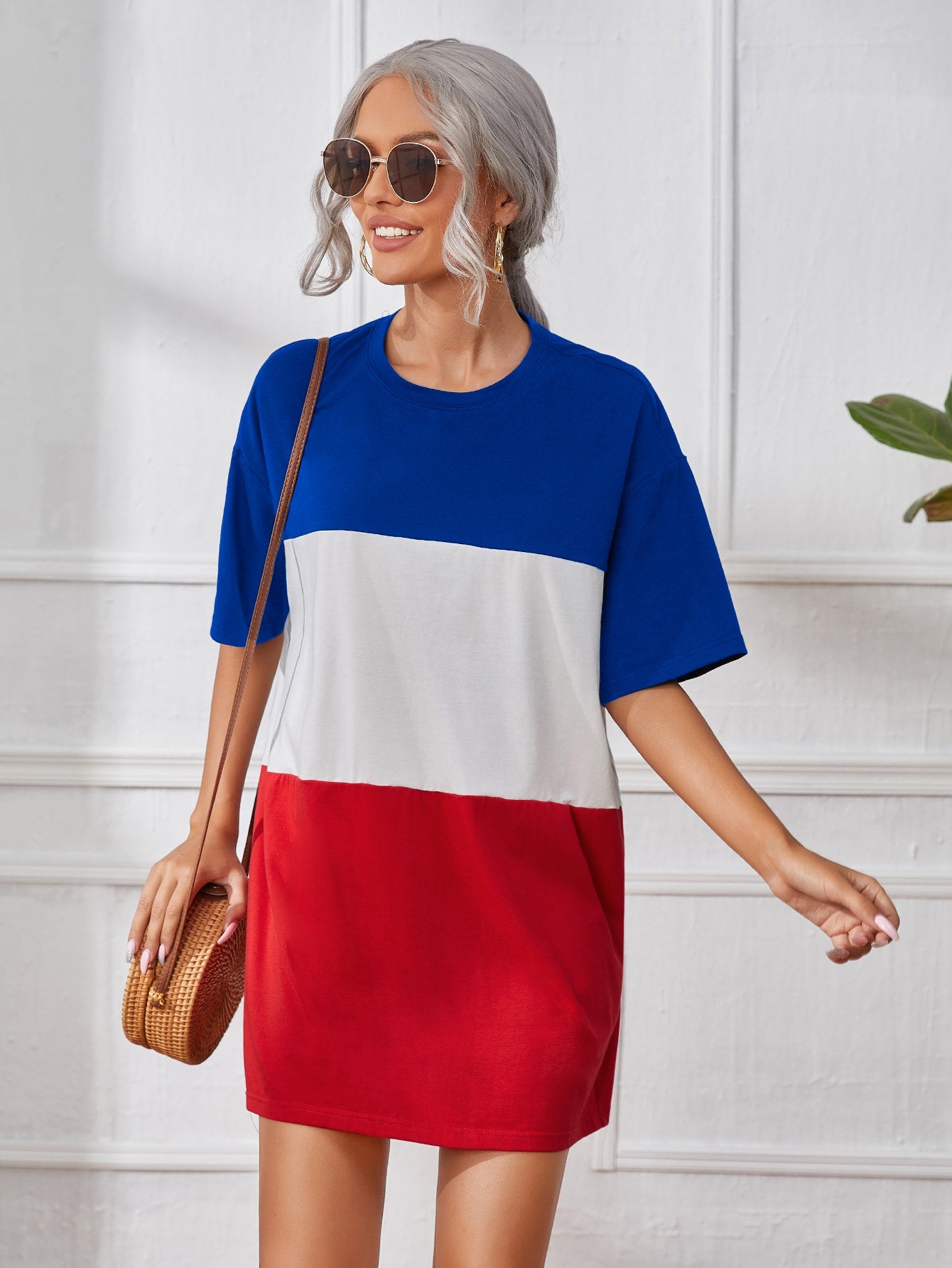 Colorblock Half Sleeve Round Neck Straight Natural Mini Dress