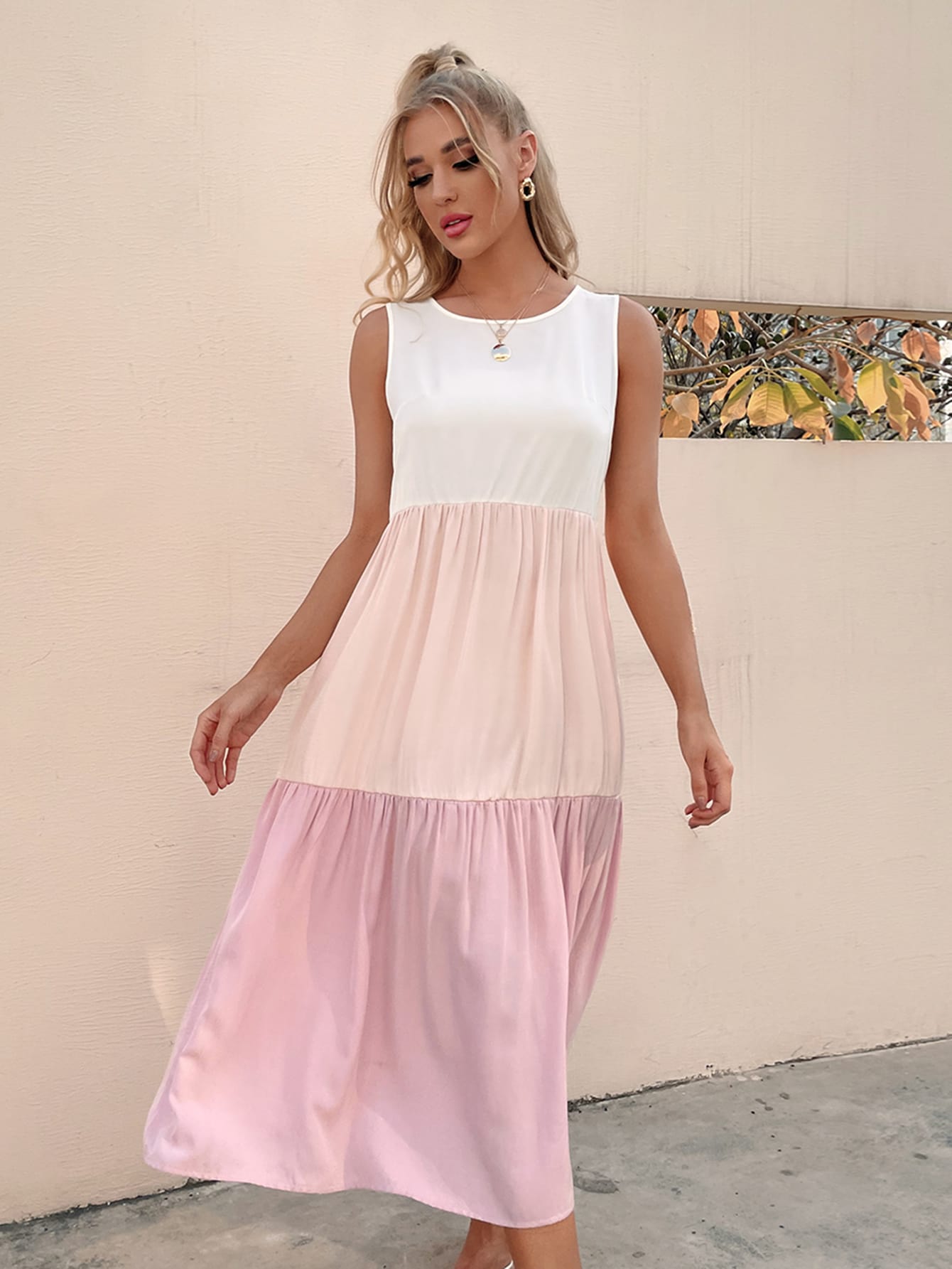 Colorblock Sleeveless Round Neck Flounce High Waist Long Dress