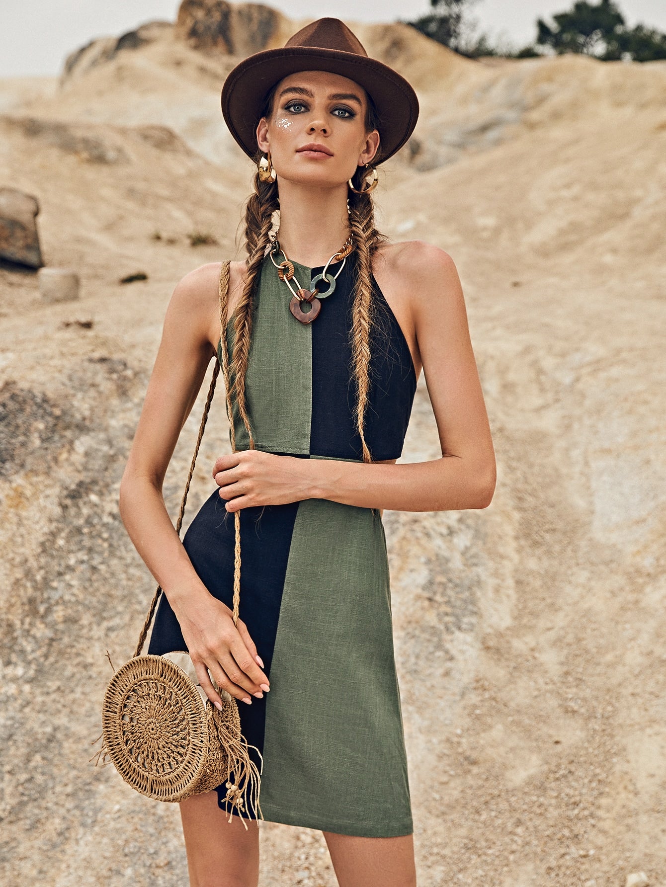 Colorblock Zipper Sleeveless Halter Straight Natural Short Dress