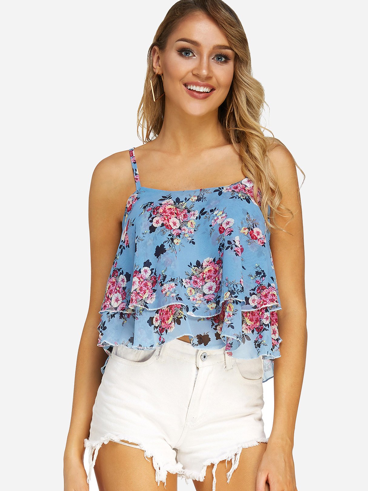 Débardeur bleu à lacets et imprimé floral personnalisé, sans manches, ourlet volanté