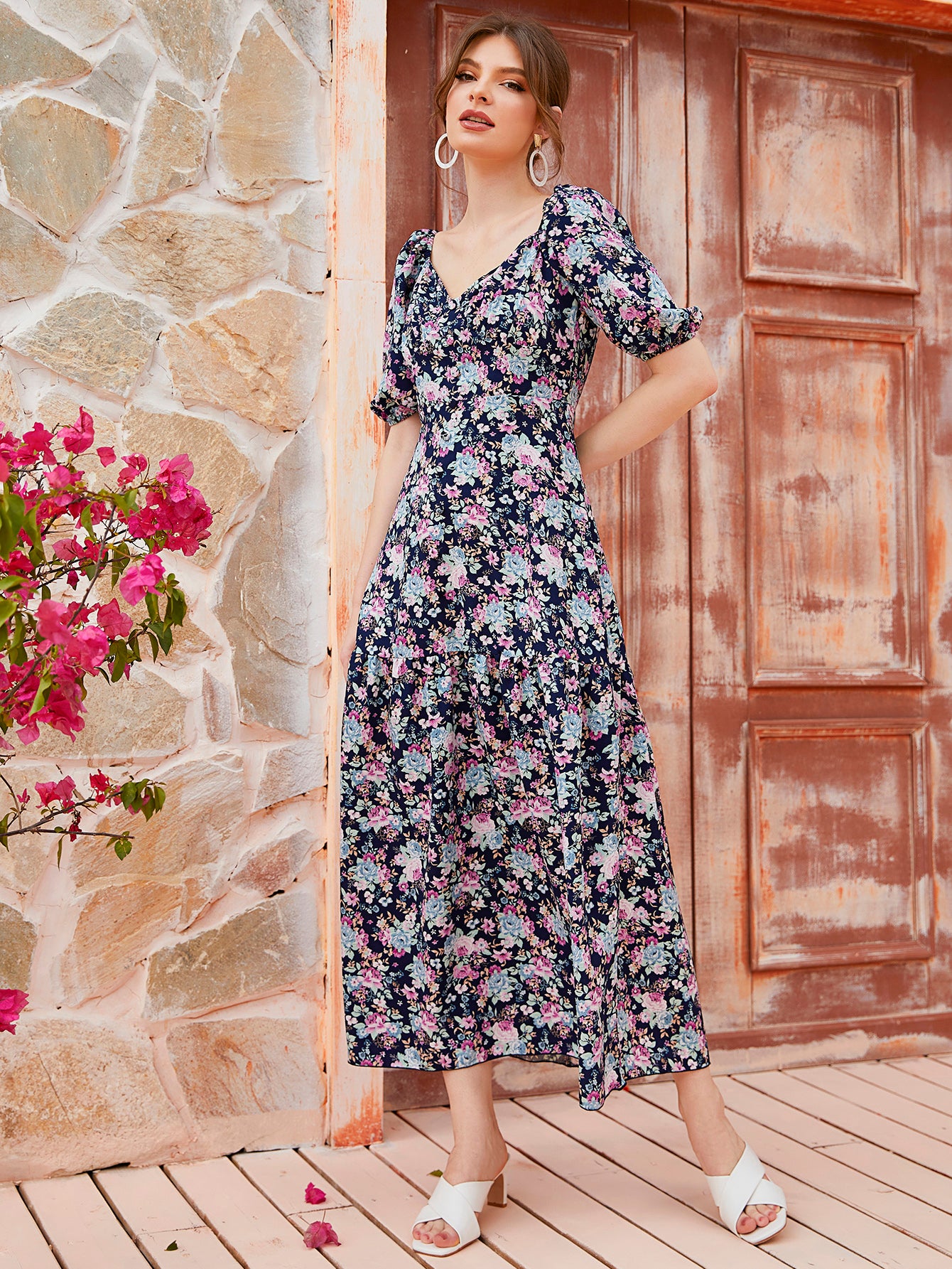 Ditsy Floral Button Front Short Sleeve Sweetheart Flounce High Waist Long Dress