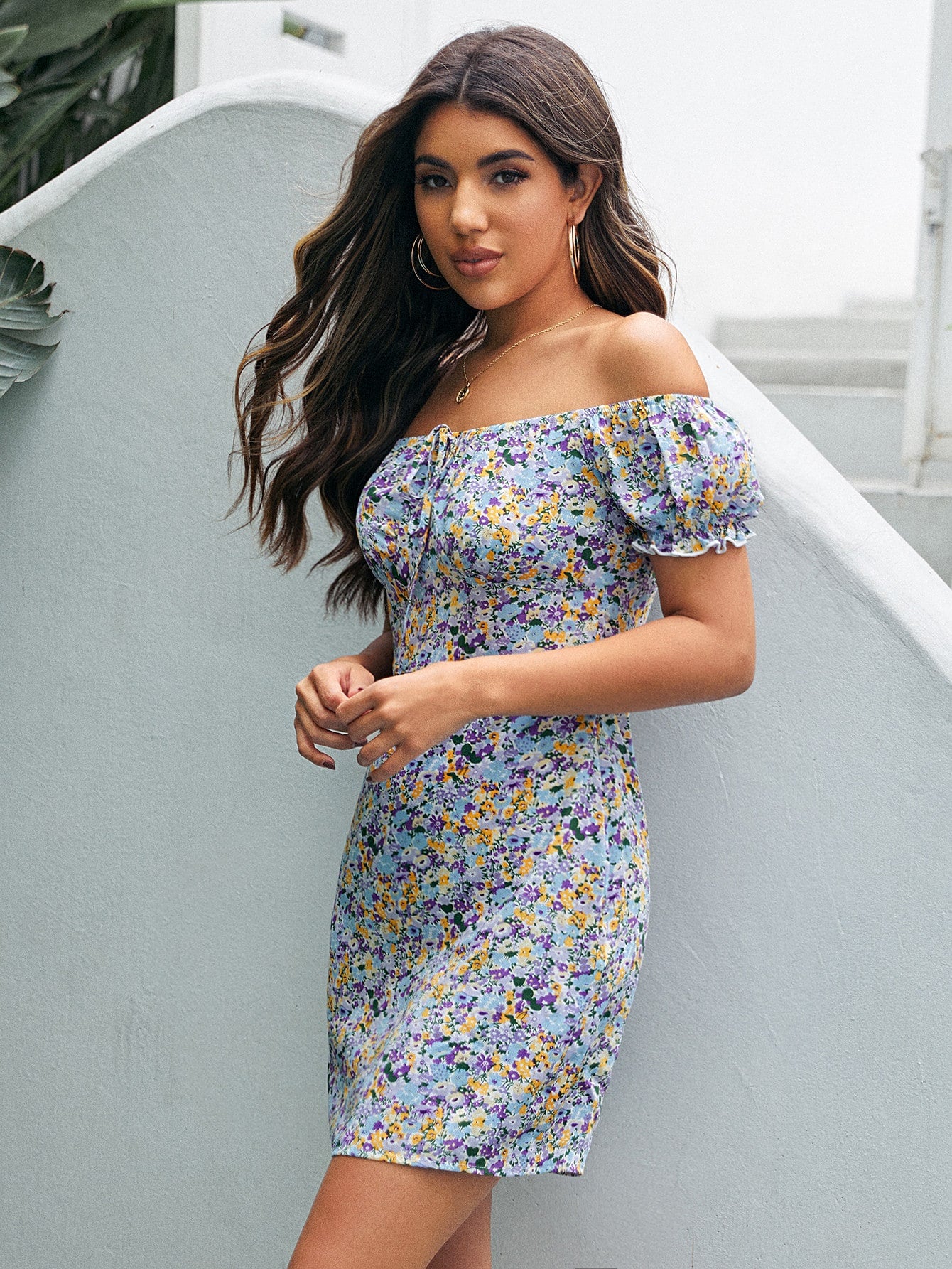 Ditsy Floral Knot Short Sleeve Sweetheart Straight Natural Short Dress