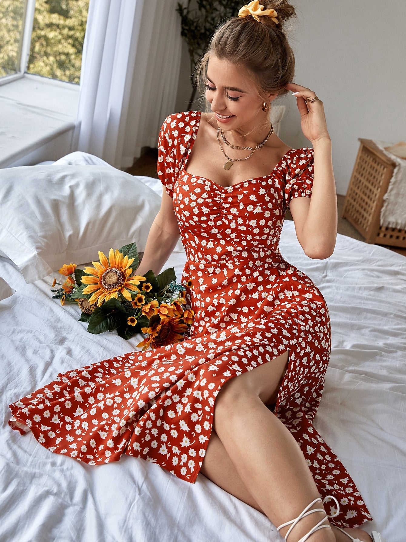 Ditsy Floral Shirred Short Sleeve Sweetheart Slit High Waist Long Dress