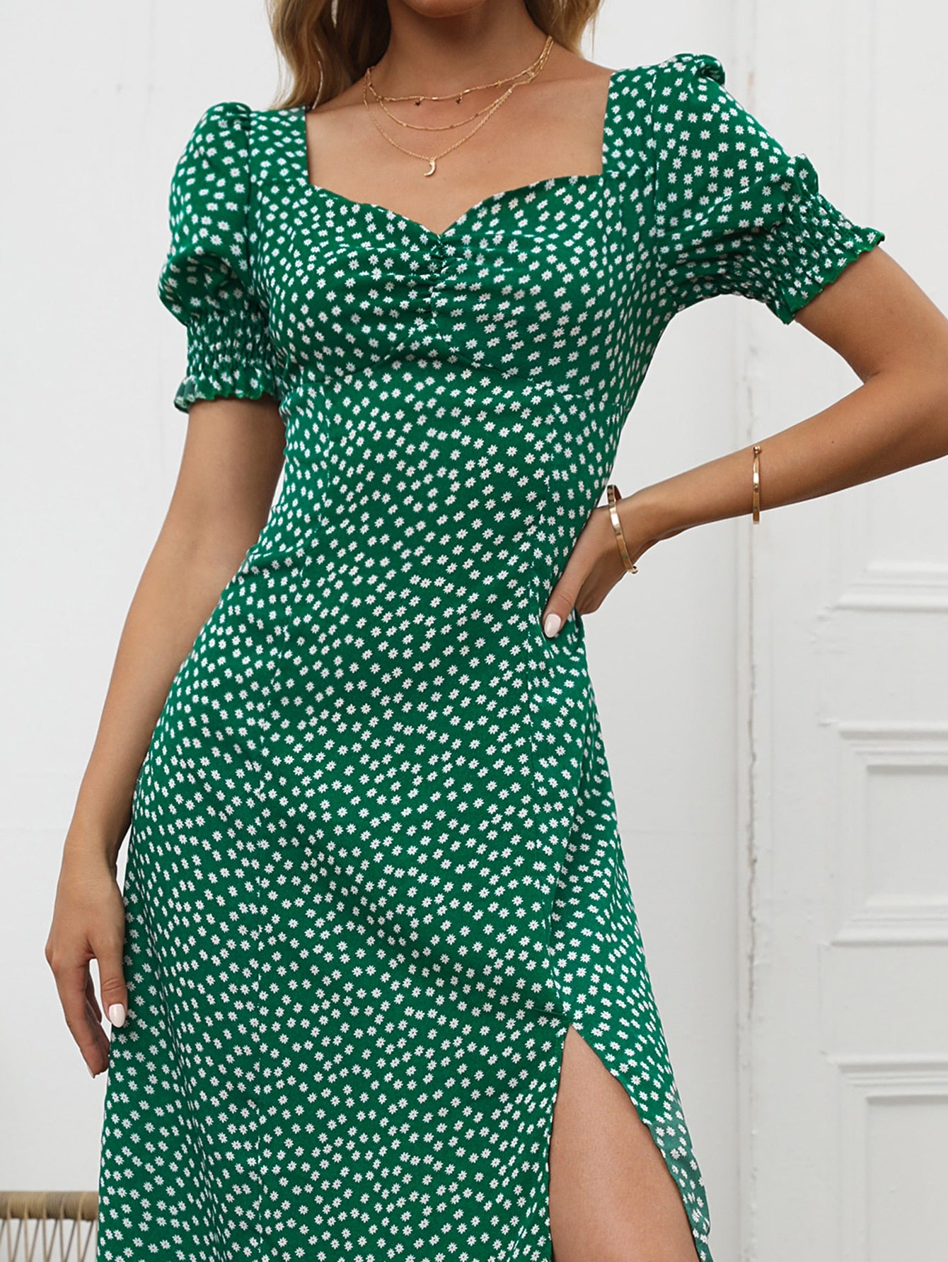 Ditsy Floral Shirred Short Sleeve Sweetheart Slit High Waist Midi Womens Dress