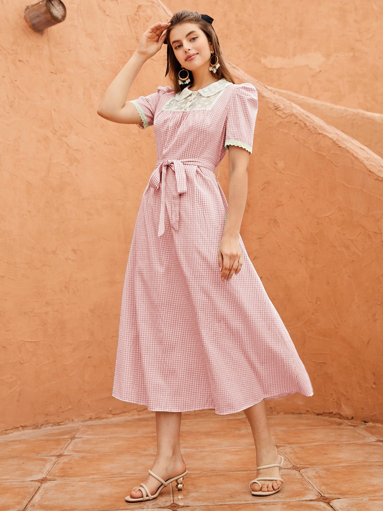 Gingham Belted Short Sleeve Peter Pan Collar Flared High Waist Long Dress
