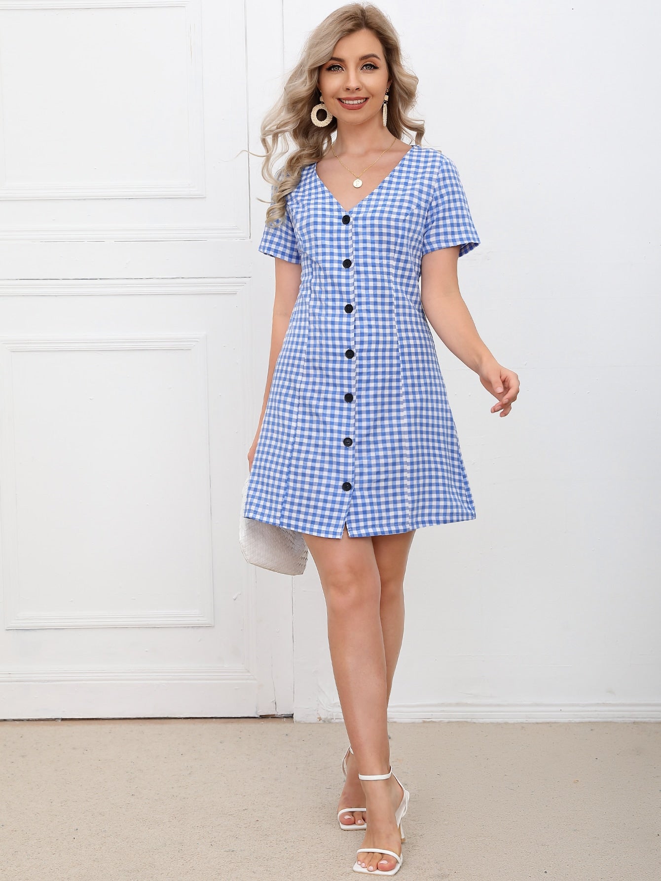 Gingham Button Front Short Sleeve V Neck Straight Natural Short Dress