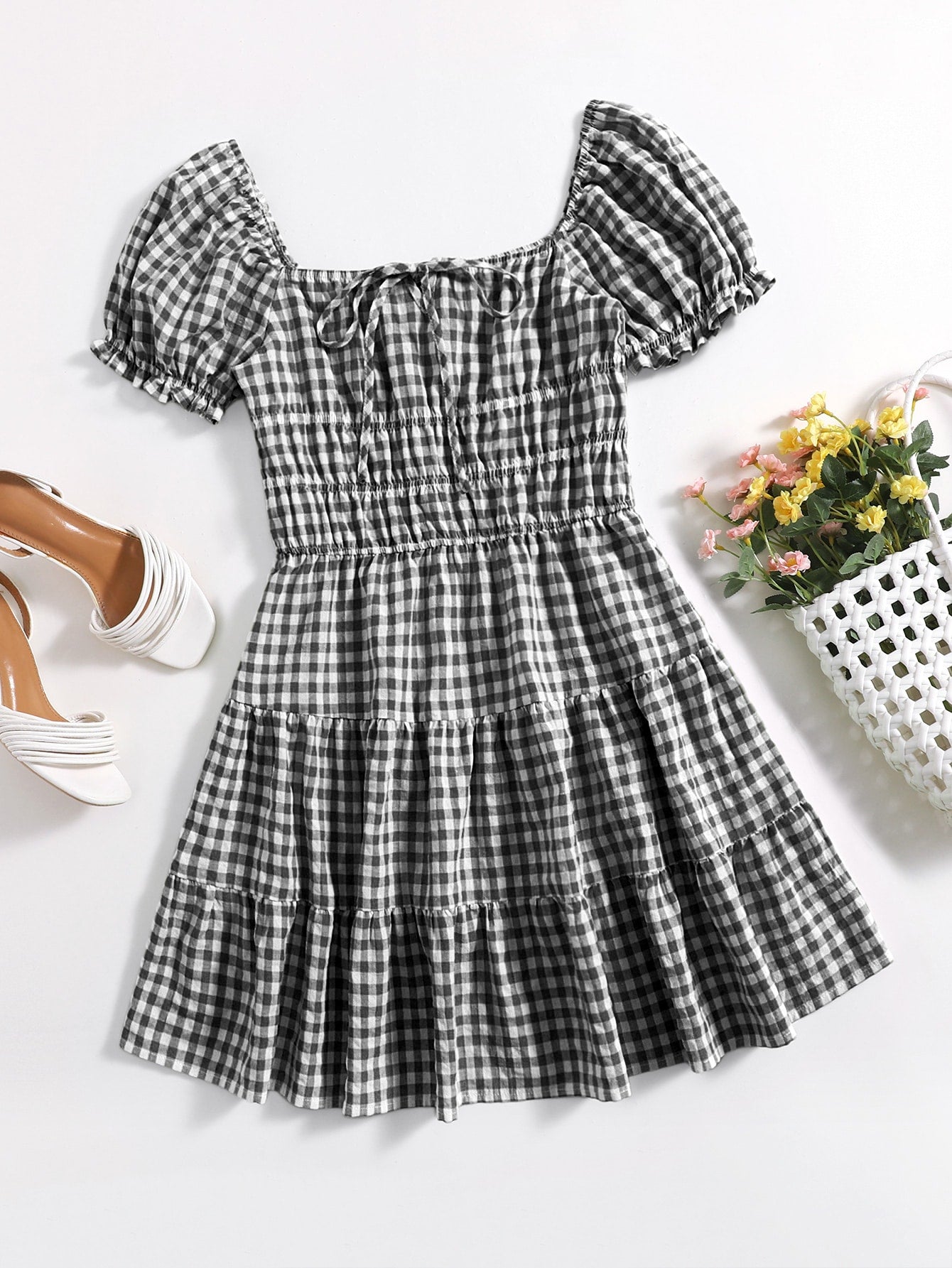 Gingham Tie Front Short Sleeve Square Neck Flounce High Waist Short Dress