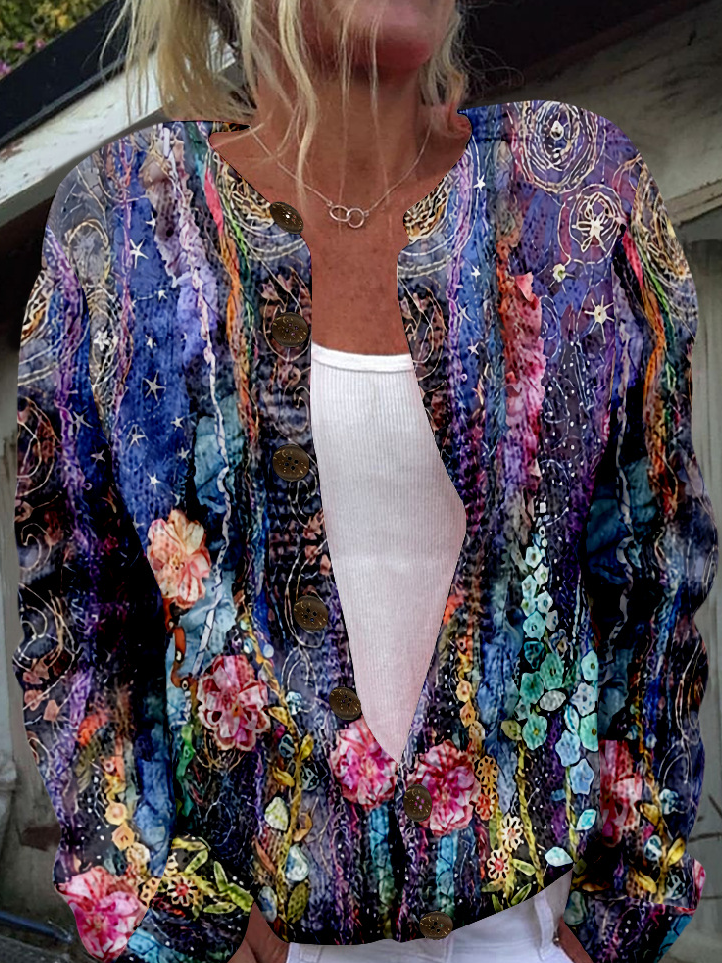 Loose Crew Neck Long Sleeve Floral Casual Regular Jacket