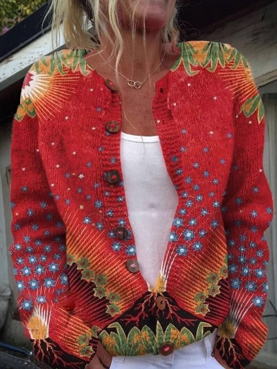 Loose Crew Neck Long Sleeve Floral Casual Regular Jacket