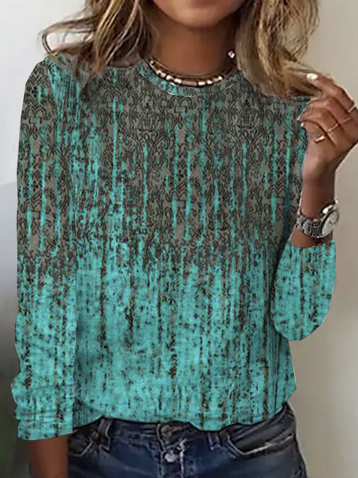 Loose Long Sleeve Crew Neck Ethnic Casual Regular T-Shirt