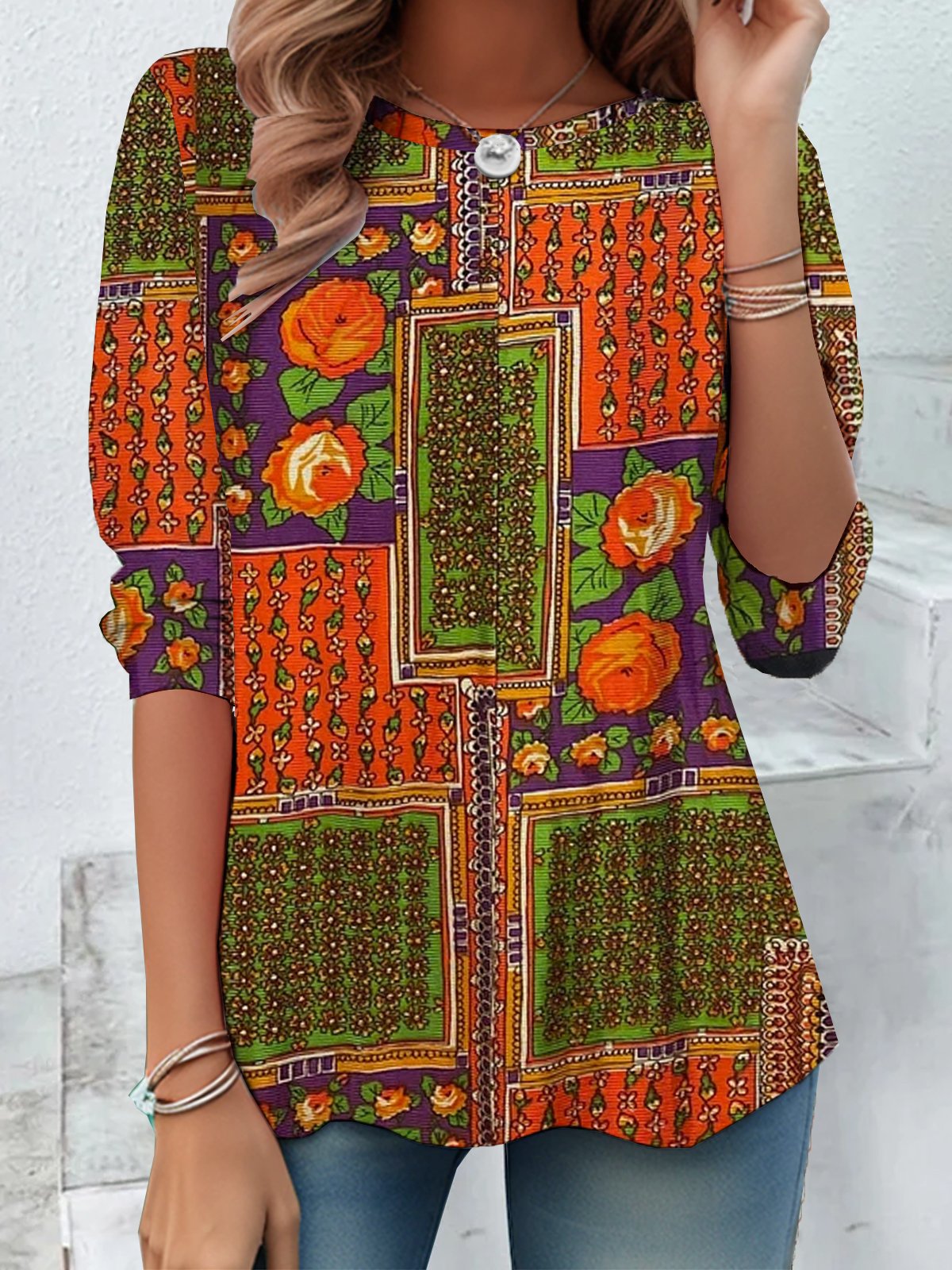Loose Long Sleeve Crew Neck Floral Casual Regular T-Shirt