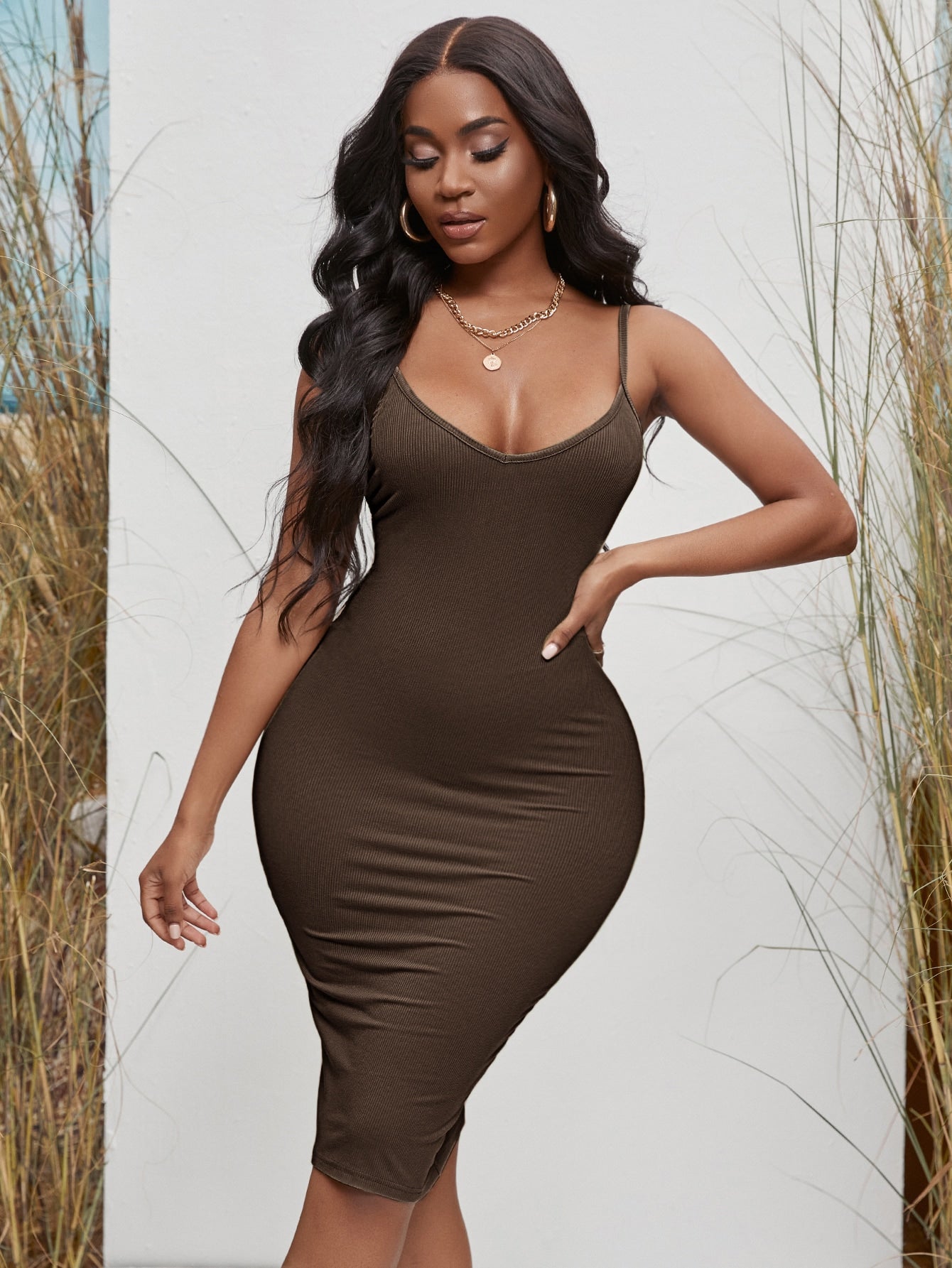 Plain Backless Sleeveless Spaghetti Strap Pencil Natural Midi Dress