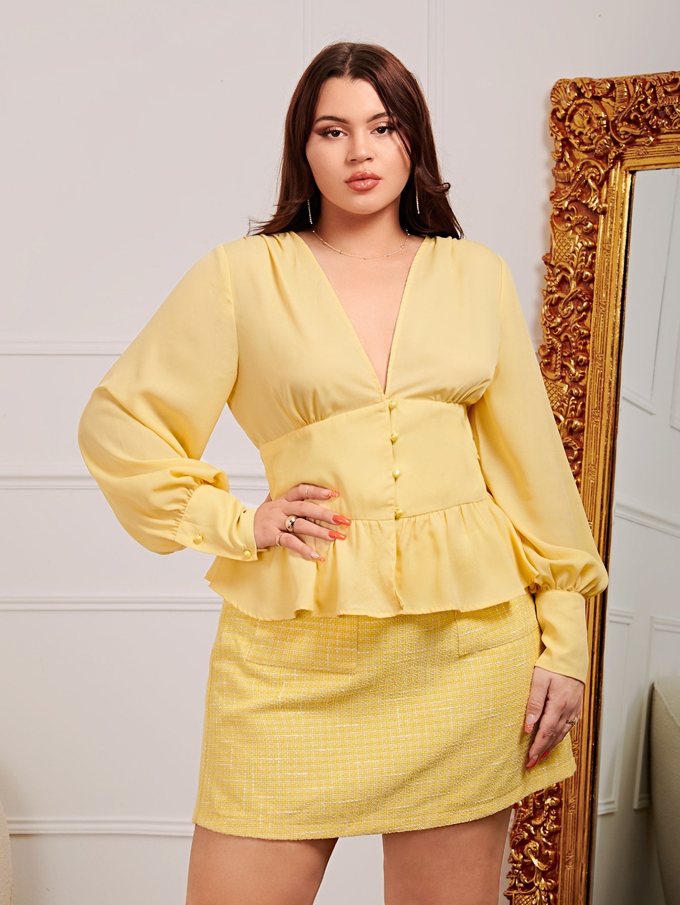 Plain Button Front Long Sleeve Deep V Neck Flared Regular Plus Size Blouse