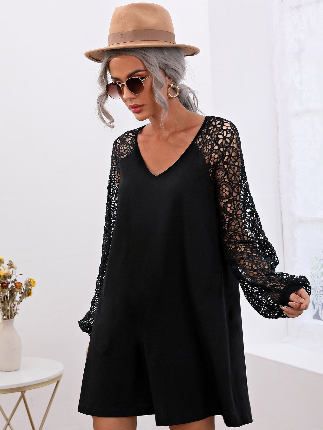 Plain Contrast Lace Long Sleeve V Neck Straight Natural Short Womens Dress