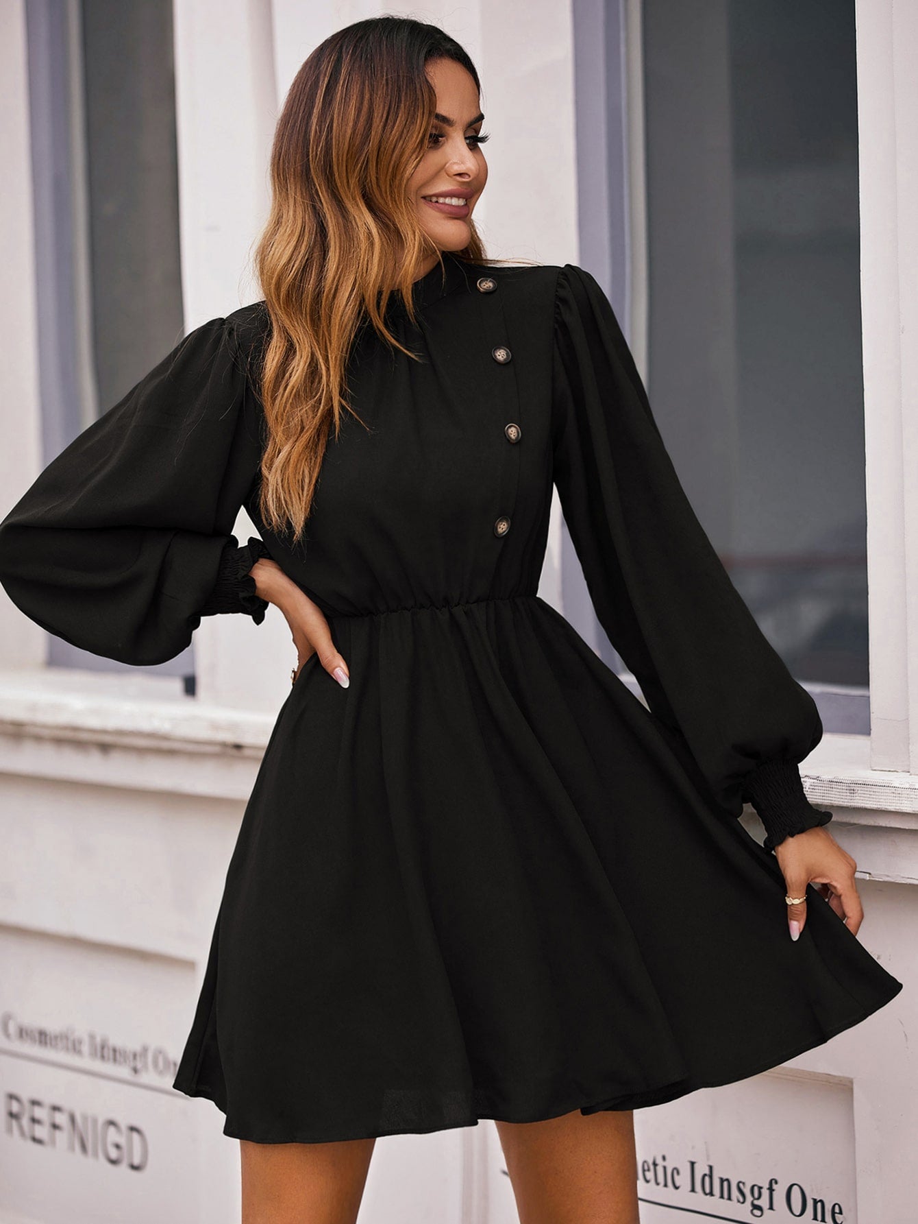Plain Fake Buttons Long Sleeve Stand Collar Flared High Waist Short Dress