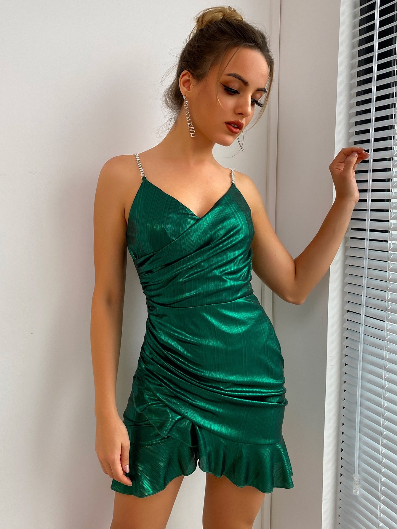 Plain Plicated Sleeveless Spaghetti Strap Flounce Natural Short Dress