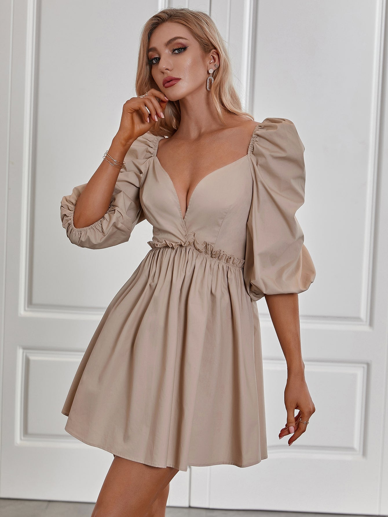 Plain Zipper Three Quarter Length Sleeve Sweetheart Flared High Waist Short Dress