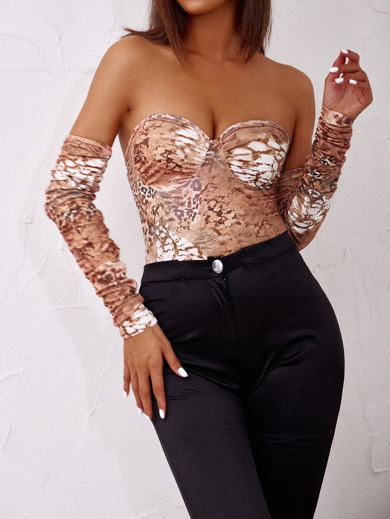 Sexy All Over Print Ruched Long Sleeve Strapless Natural Women Bodysuit