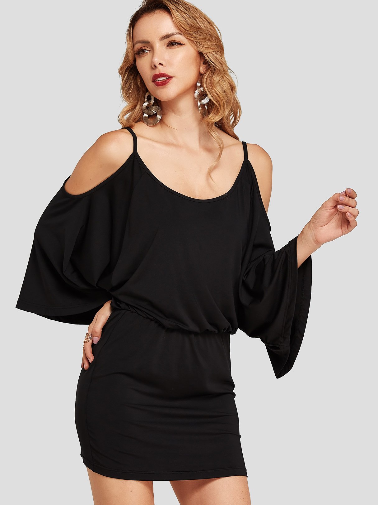 Robes noires à manches longues et épaules dénudées, découpées unies, bretelles spaghetti, vente en gros