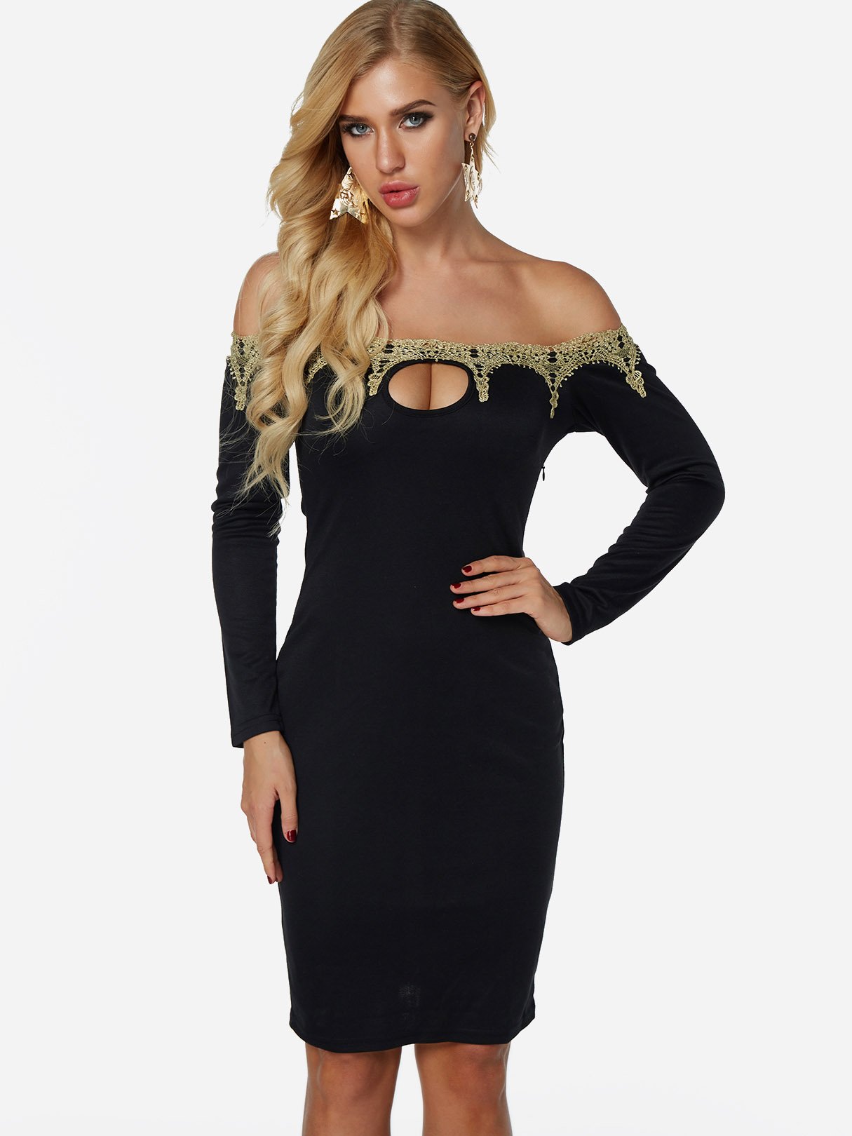 Robes noires à épaules dénudées, manches longues, unies, en dentelle au crochet, ornées de découpes, vente en gros