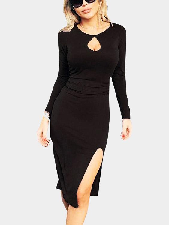 Robes noires à col rond, manches longues et ourlet fendu, vente en gros