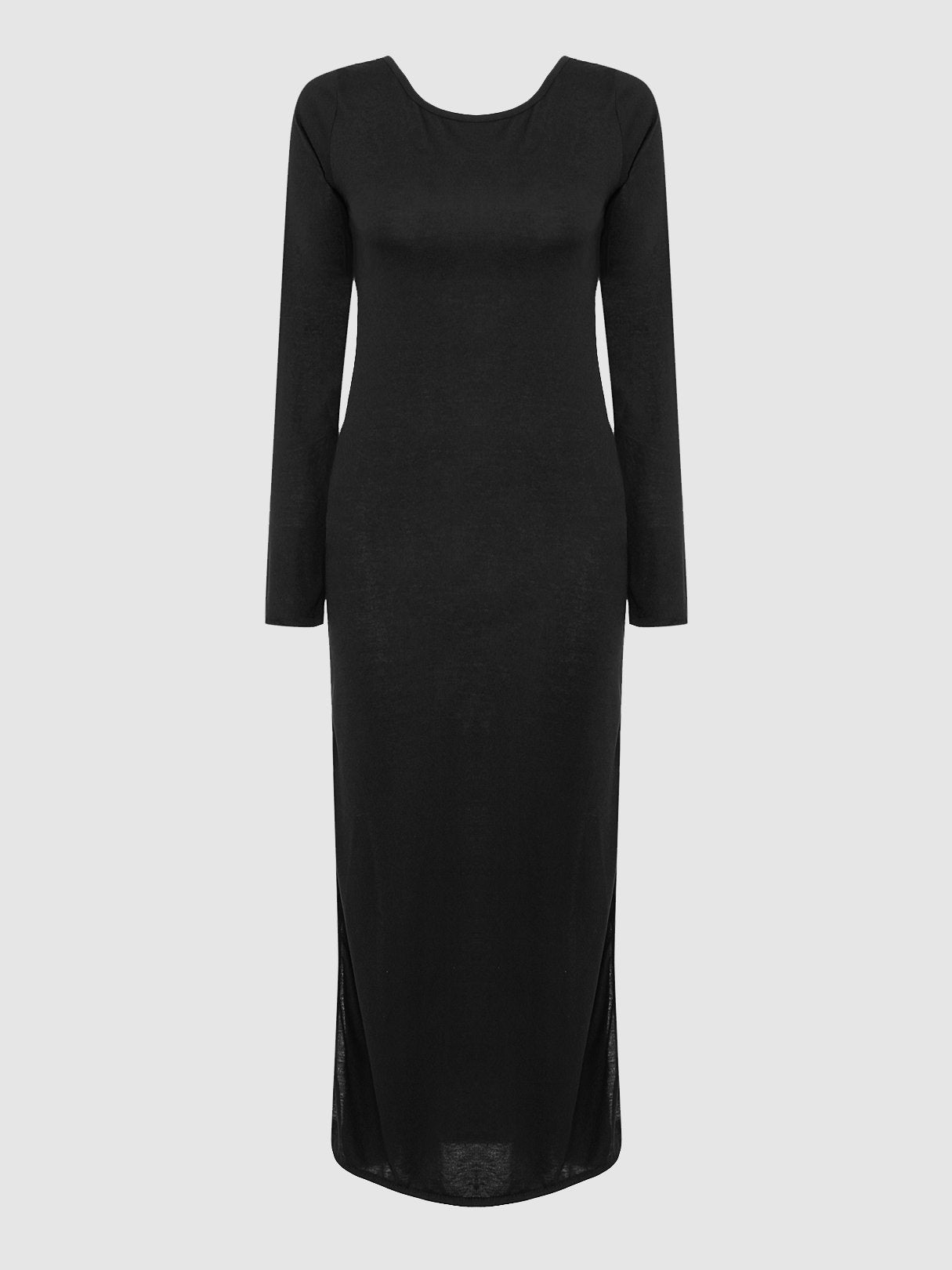 Robe mi-longue noire à col rond et manches longues, couleur unie, dos nu, ourlet fendu, vente en gros