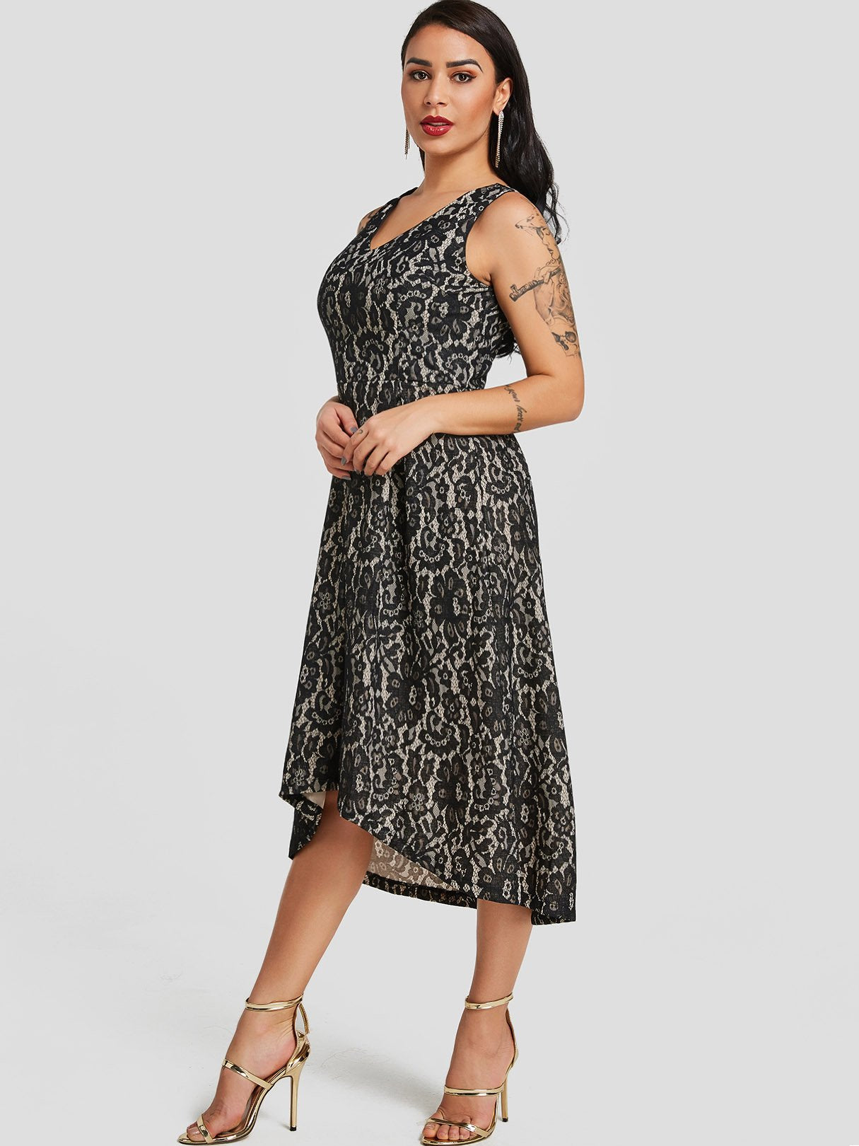 Robes mi-longues noires, col en V, sans manches, unies, en dentelle au crochet, ornées de fermeture éclair au dos, dos nu, vente en gros