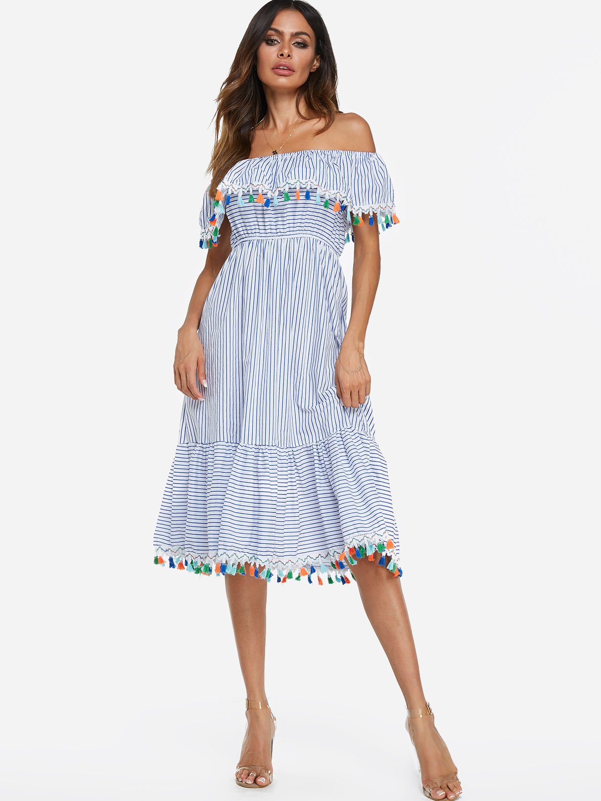 Robes bleues à épaules dénudées, sans manches, à rayures, pompon, ourlet, vente en gros