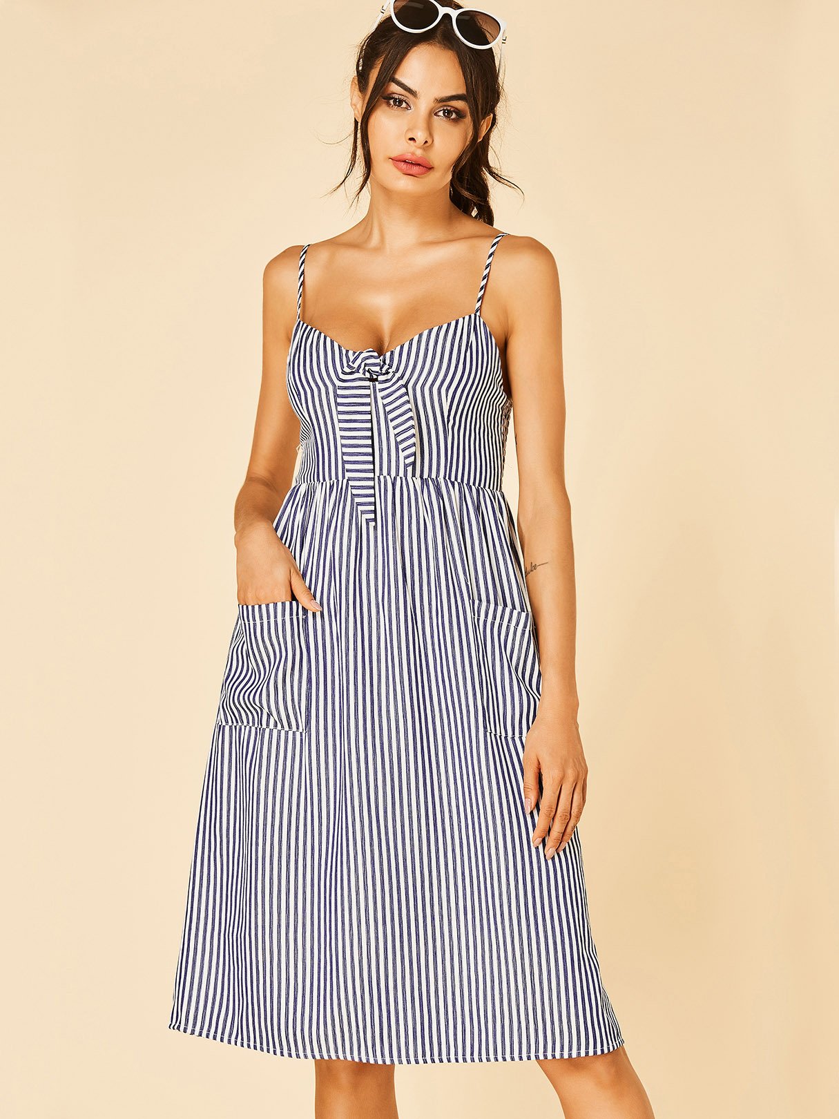 Robes mi-longues bleues à col en V, sans manches, à rayures, dos nu, taille haute, vente en gros