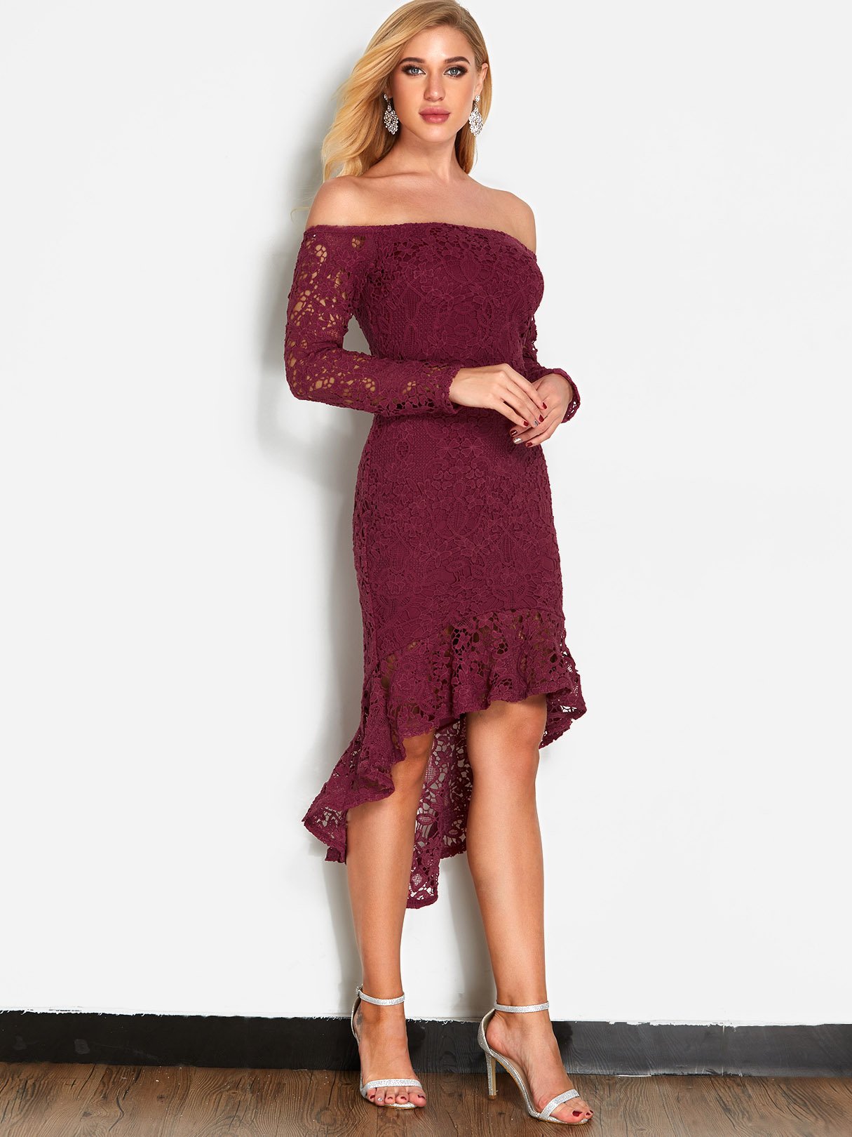 Robes bordeaux à épaules dénudées, manches longues, dentelle, fermeture éclair au dos, ourlet volanté, vente en gros
