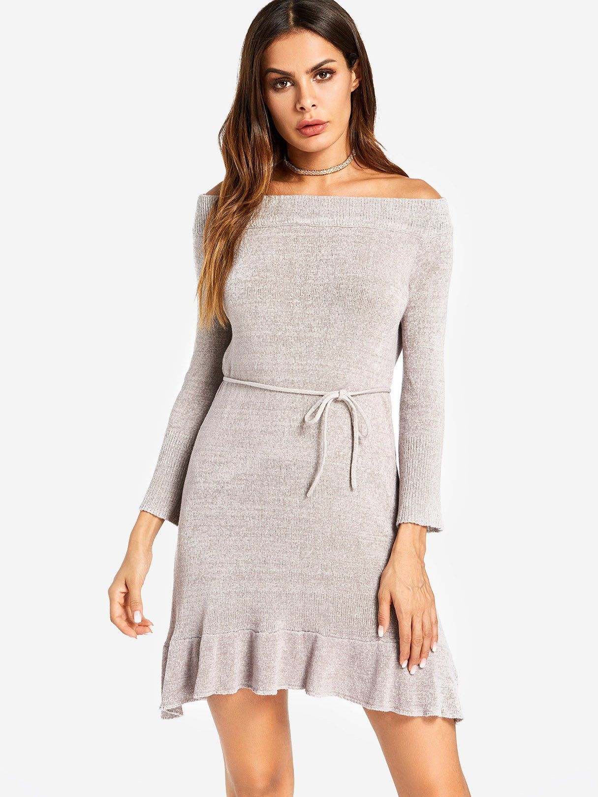 Robes grises à épaules dénudées, manches longues, unies, à nouer soi-même, ourlet incurvé, vente en gros