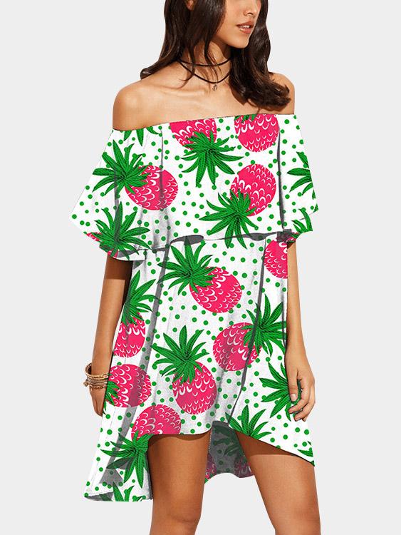 Vente en gros de robes à ourlet irrégulier à manches courtes et imprimé floral à épaules dénudées