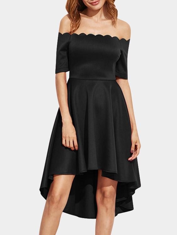Robe noire taille haute, épaules dénudées, manches courtes, ourlet irrégulier, vente en gros