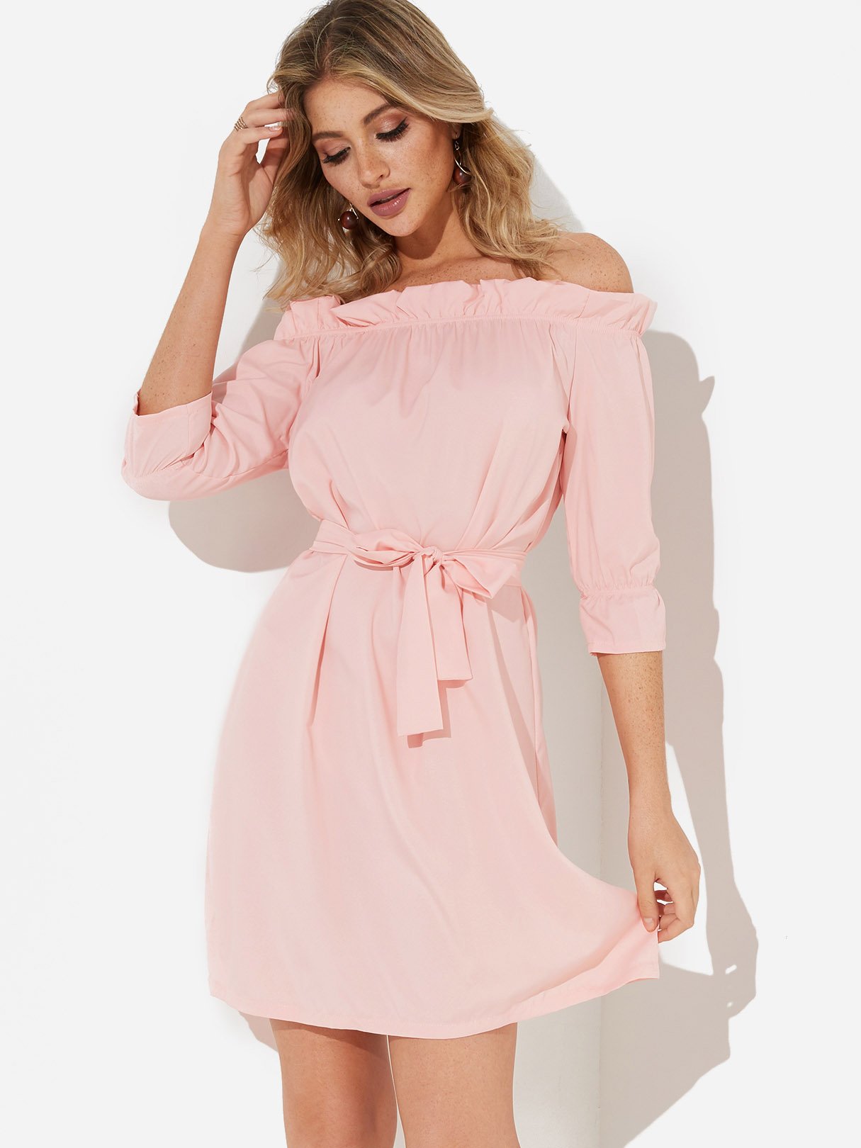 Vente en gros de robes roses à épaules dénudées, manches 3/4, unies, à nouer soi-même