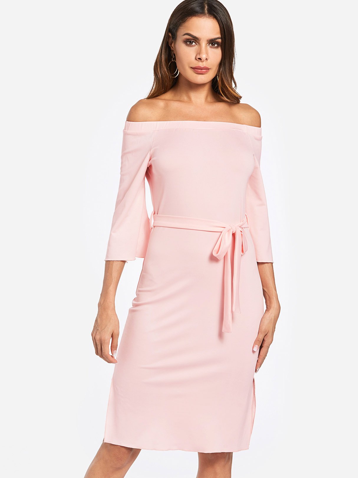 Robes roses à épaules dénudées, manches 3/4, unies, à nouer soi-même, ourlet fendu, vente en gros