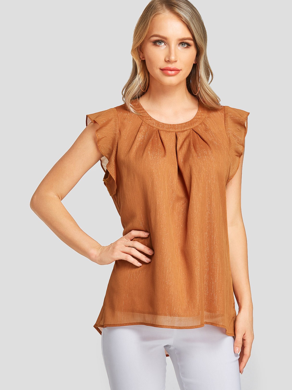 Débardeur café à ourlet incurvé plissé uni à col rond en gros