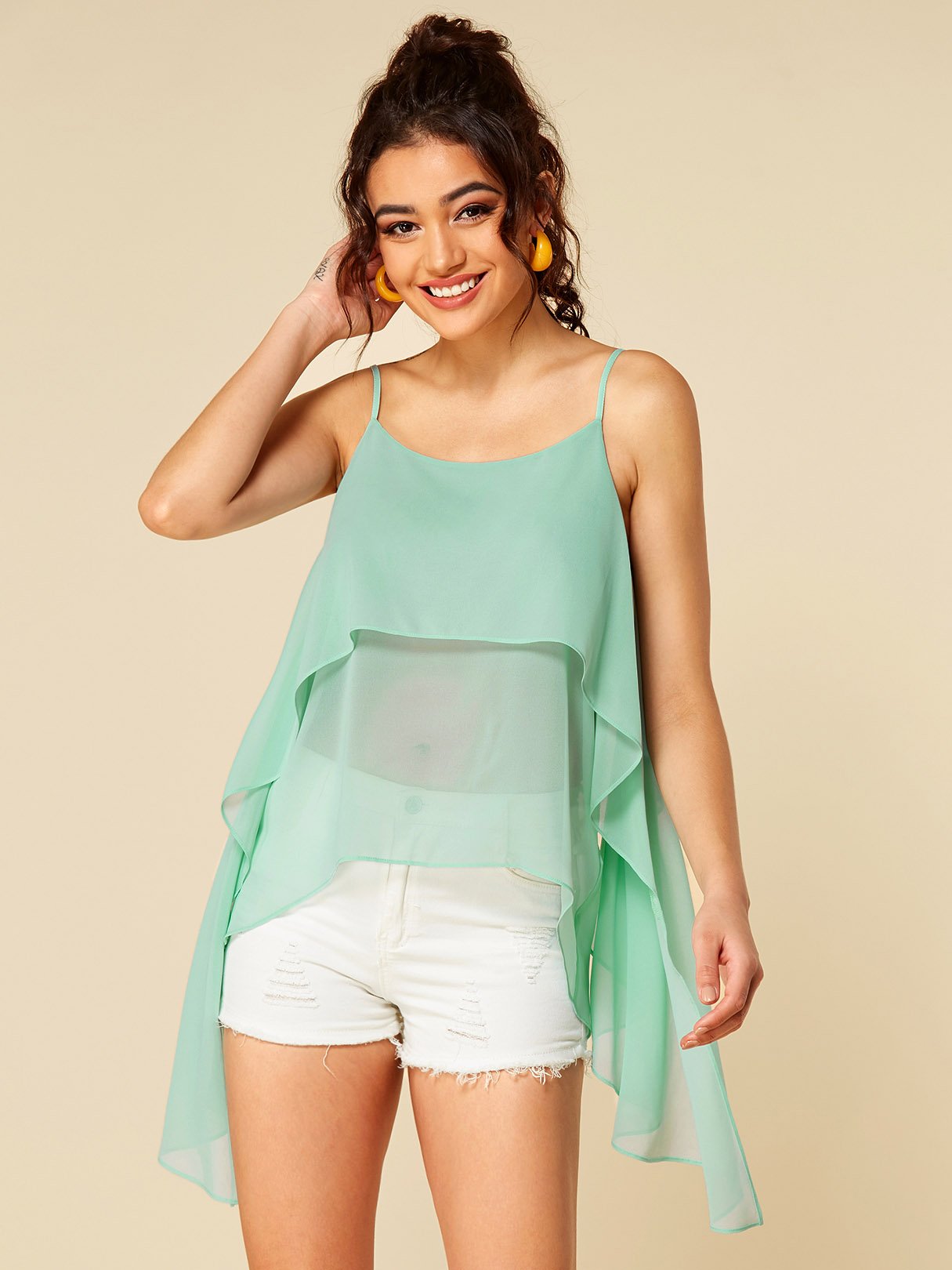 Camis vert à col rond uni, dos nu, bretelles Spaghetti, sans manches, ourlet irrégulier, vente en gros