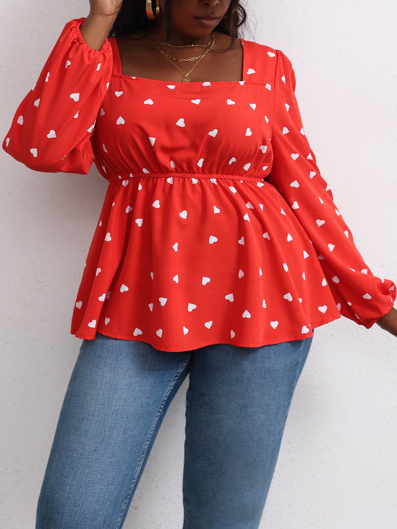 All Over Print Ruffle Hem Long Sleeve Square Neck Flared Regular Plus Size Blouse