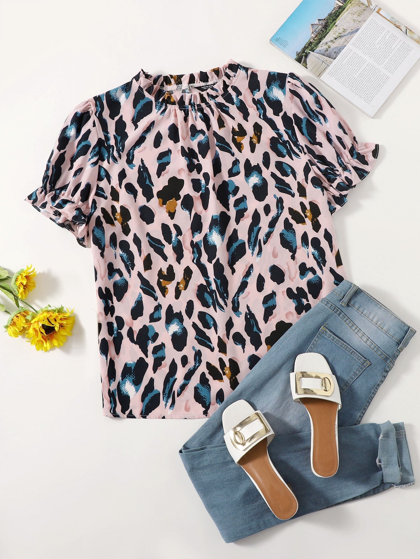 All Over Print Ruffle Short Sleeve Stand Collar Regular Plus Size Blouse