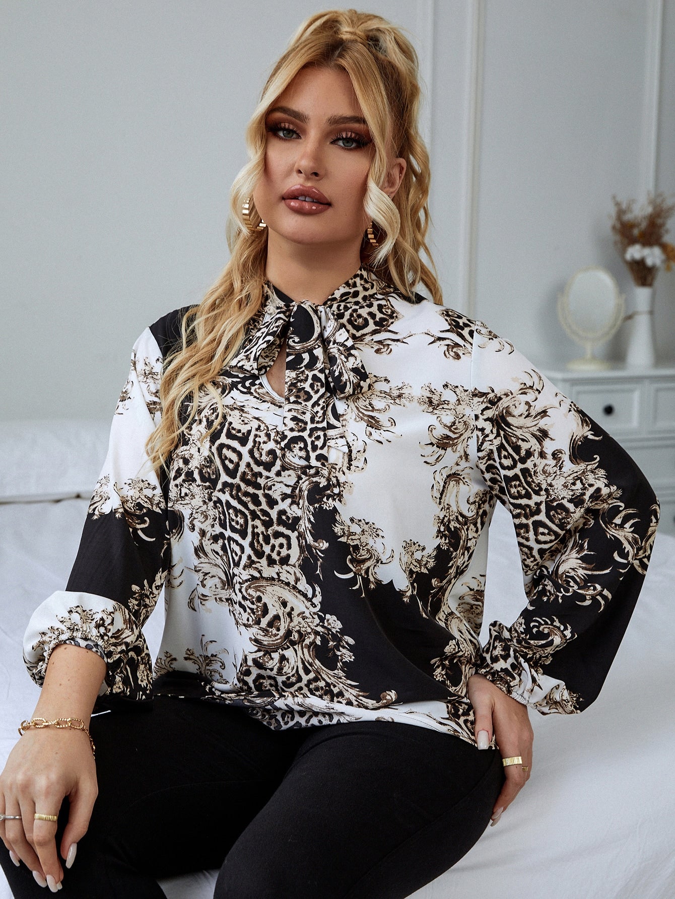 Baroque Tie Front Long Sleeve Tie Neck Regular Plus Size Blouse