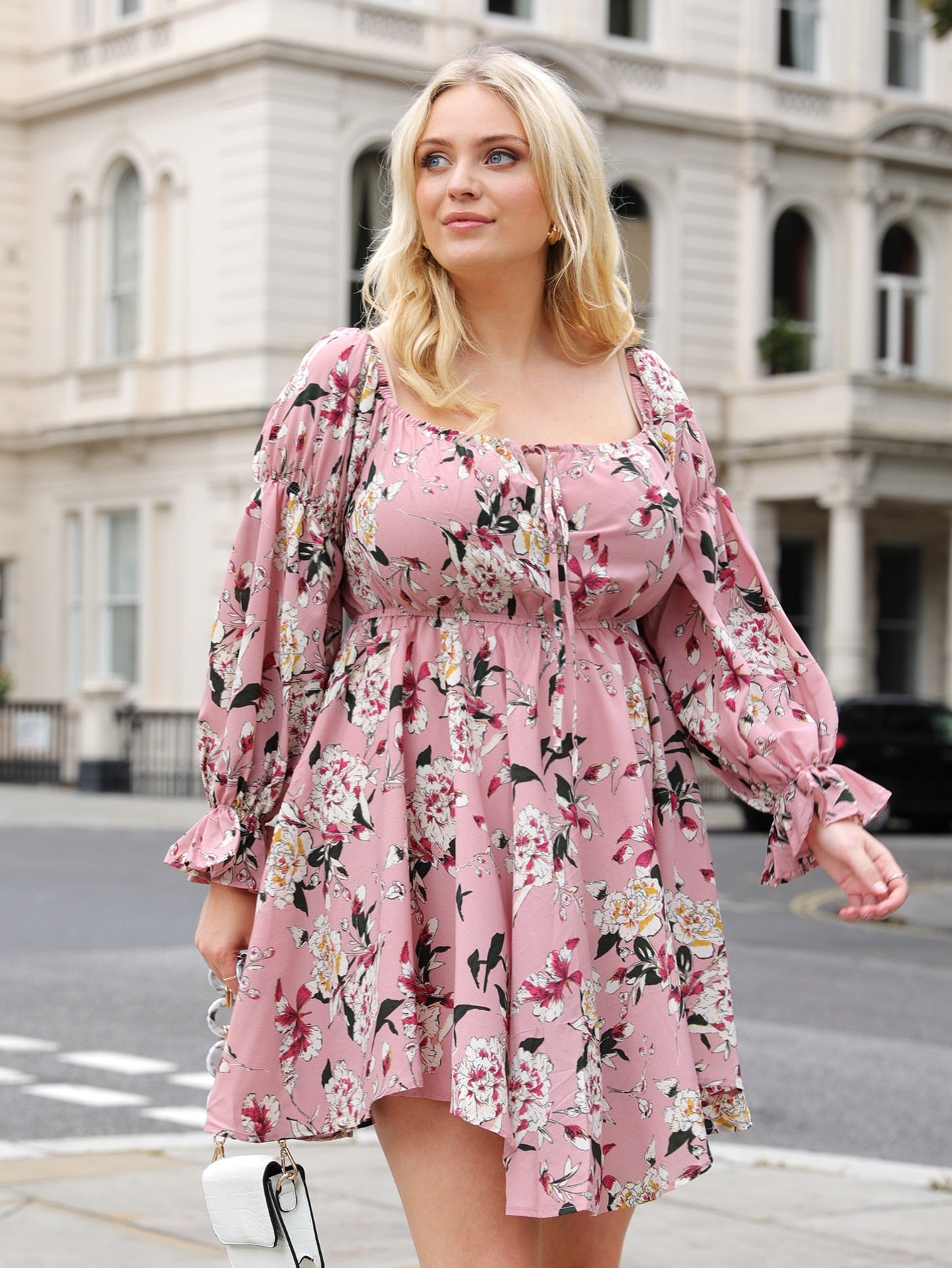 Boho Floral Ruffle Long Sleeve Square Neck Asymmetrical High Waist Short Plus Size Dress